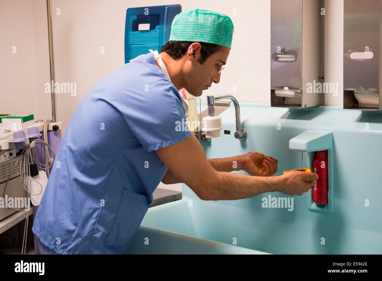 Chirurgien Male Se Laver Les Mains Avec De La Betadine Desinfectant In Operating Room Photo Stock Alamy